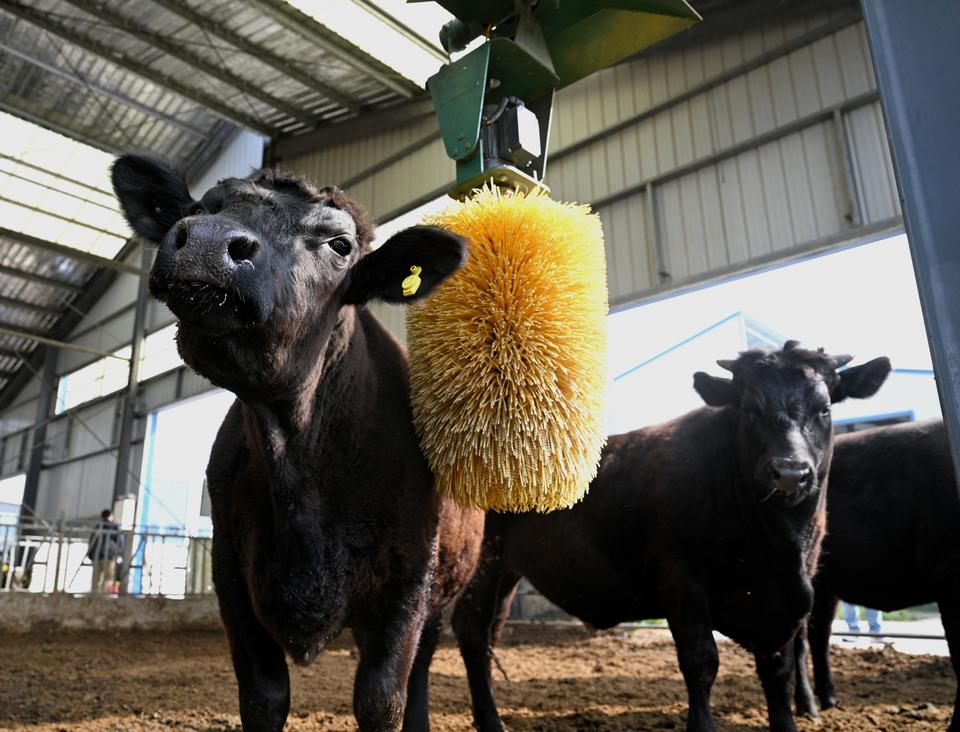 走进阳信县亿利源5G数字化牧场,牛棚里的音乐声不绝于耳。炎热的夏天已然到来,牛棚里的风扇也都转了起来。牛儿有的在软床上吹着风舒适躺卧;有的把头探出栏杆外吃饲养员刚刚撒好的饲料;有的则漫步到滚动刷旁边“自助”洗澡、按摩。这些享受着“VIP”待遇的鲁蒙黑牛是经过多年研究培育的阳信“活特产”——通过引进新西兰安格斯黑牛,与当地的鲁西黄牛、渤海黑牛进行杂交培育,阳信县最终培育出了肉质好、抗病性强、繁育能力佳的鲁蒙黑牛,并进行规模化养殖。
