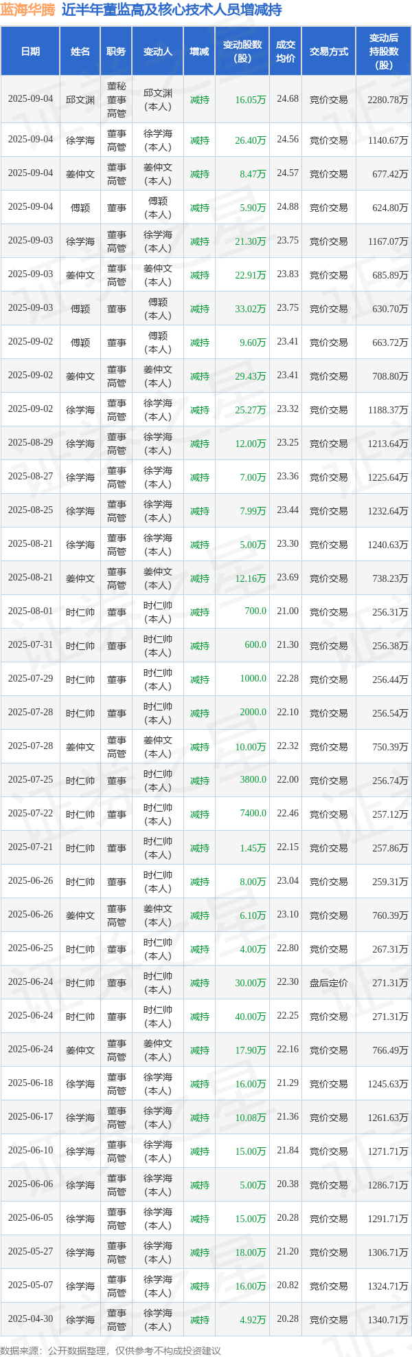 蓝海华腾近半年内的董监高及核心技术人员增减持详情如下: